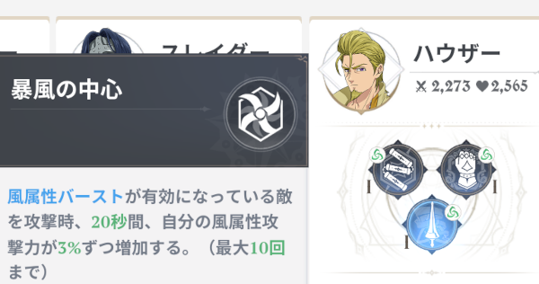 | パッシブ | 正義感 自分が風属性バーストを活性化させると、20秒間チーム全体の風属性攻撃力が15%増加する。 |