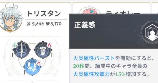 トリスタンが火炎属性バーストを発生させると、味方の火炎属性攻撃を強化します。特殊攻撃で火炎属性防御デバフも付与できるので、バースト発動後は火炎アタッカーにスイッチして攻めましょう。