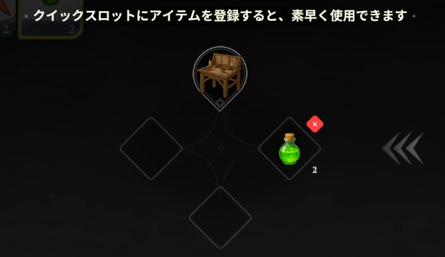 回復アイテムなどはバッグから「登録」ボタンを押すと、クイックスロットに登録できます。戦闘時にワンボタンで使えるようになるため、忘れず登録しましょう。