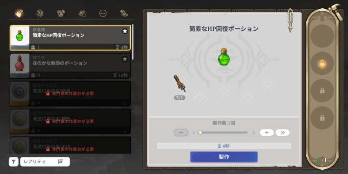 決められた素材を消費して、アイテムを作成しましょう。アイテムごとに決められた製作時間が経てば作成完了です。