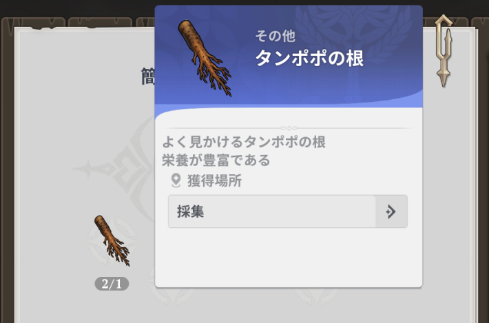 一部アイテムを除き、材料のアイコンをクリックすると獲得場所が表示されます。フィールドで採集できるアイテムなどは、獲得場所からマップにピンを差すこともできます。