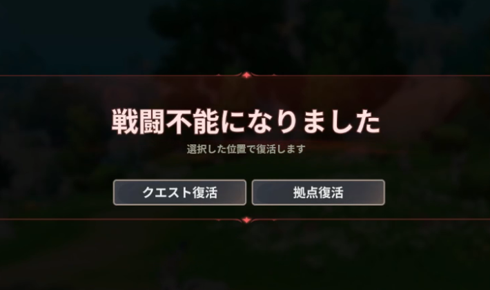 HPが無くなった場合、近くのポイントで復活できます。復活直後はHPが50%なので、クエストなどに続けて挑戦する場合は回復してから挑みましょう。