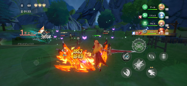 | 赤属性キャラが2人以上 | 巨大な火柱でダメージを与え、防御力を減少させる。 |