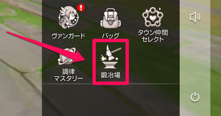 メニュー画面の「鍛冶場」をタップしても鍛冶場に移動できます。「鍛冶場」はメニュー画面の右下に表示されます。