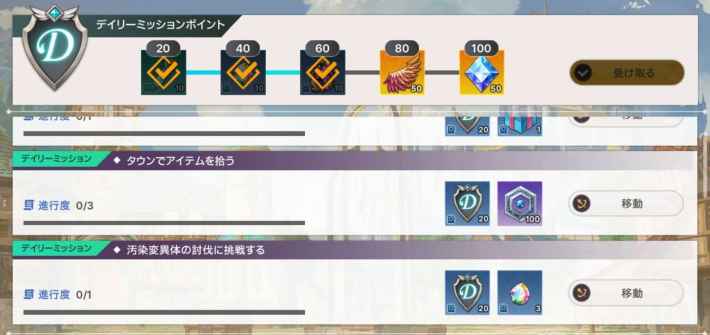 タウン内で落し物・壺・宝箱を3回拾うことで、デイリーミッションをクリアできます。ミッションクリアでマナリングやデイリーミッションポイントを入手可能です。