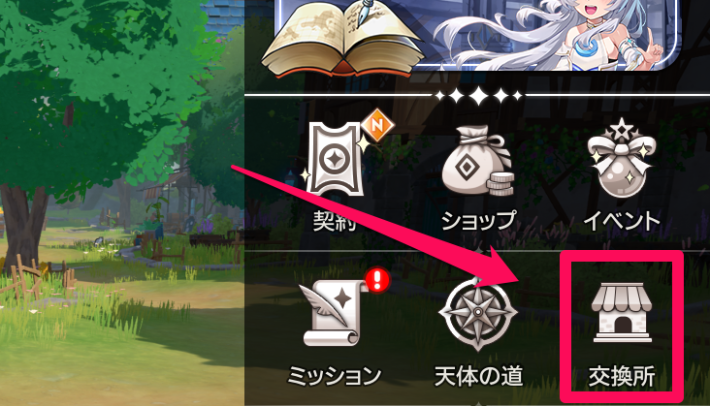 交換所の画面は、メニュー画面からも開けます。メニュー画面右側の「交換所」を選択しましょう。