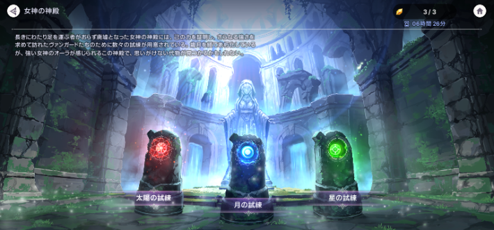 アビリティの強化に必要な古書は、「女神の神殿」で入手できます。アビリティを強化したいキャラの紋章に合った試練に挑戦しましょう。