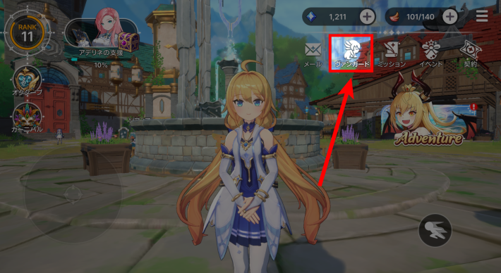 アビスディアのキャラ育成は、ヴァンガードリストから育成したいキャラを選択することでできます。ヴァンガードリストはタウンの右上アイコンから開くことができます