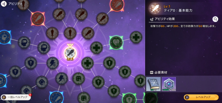 アビリティを強化することで、ステータスや与ダメージ増加、スキルのダメージアップなどの効果を得られます。