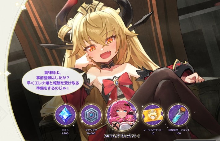 事前登録を完了することで、ゲーム内で受け取れる報酬を入手できます。SRキャラの「エレナ」やその他アイテムなどのアイテムを受け取れます。
