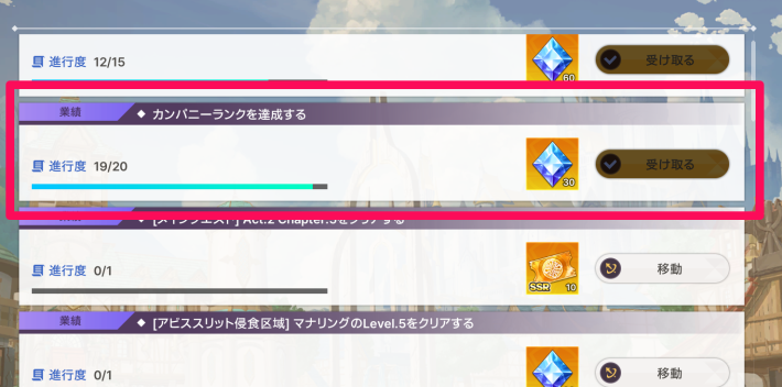 特定のランクまでカンパニーランクを上げることで「業績」のミッションをクリアできます。ミッションをクリアするとエストを入手可能です。
