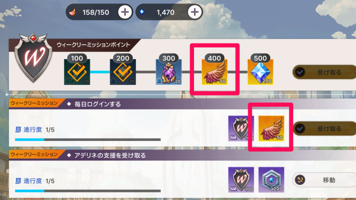 スタミナはデイリーミッションやウィークリーミッション、アデリネの支援で回復できます。ミッション報酬では経験値はもらえないですが、その分のスタミナを獲得できるため毎日クリアしましょう。