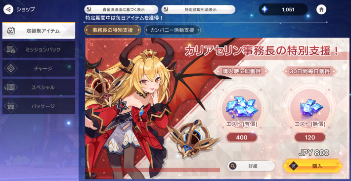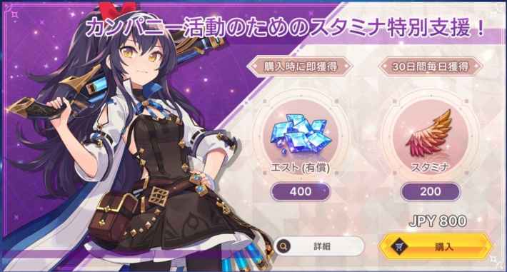 | カンパニー活動支援 | エスト(有償)400個 スタミナ 200(30日間) | 800円 |