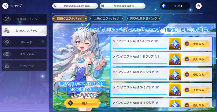 | 初級 クエストパック | エスト(有償)1,650個 エスト(無償)4,950個 | 3,300円 |