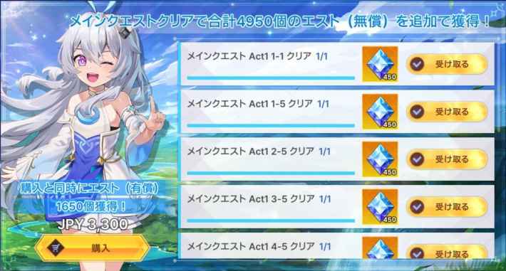 初級クエストパックを購入すると、即座に有償エストが1,650個入手できます。その後、ミッションクリアで無償エストが450個ずつ入手でき、合計6,600個のエストを獲得可能です。クエストクリアの条件はありますが、序盤から大量のエストを獲得することができます。