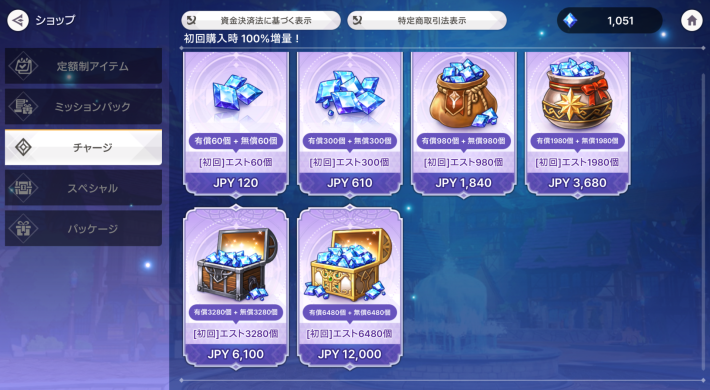 チャージでエストを購入できます。初回購入時のみエストの量が100%増加するため、通常よりもお得にエストを入手できます。