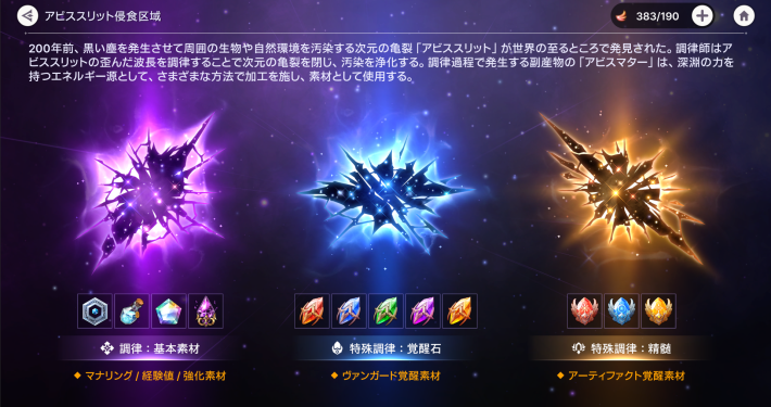 アビススリット侵食区域は、マナリングなどの基本素材やキャラとアーティファクトの覚醒素材を入手できます。メインクエストをすすめることで難易度の高いステージが解放され、レア度の高い基本素材や覚醒素材を獲得できるようになります。