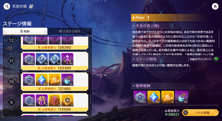 天空の塔は、階層を進めることでエストやマナリングなどの報酬を入手できます。報酬は1回までしか入手できませんが、多くのエストやガチャチケットを獲得できるため、キャラ強化を進められている場合はどんどん上を目指してみましょう。