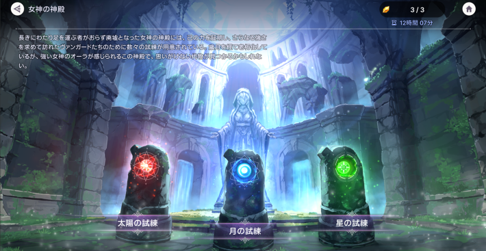 女神の神殿の挑戦には、毎日3つ回復する女神の神殿の加護石を消費します。スタミナは消費せず、負けても挑戦権は減らないため忘れずに挑戦しておきましょう。