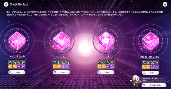 汚染変異体討伐をクリアすると、ランダムな装備や鍛冶場の装備制作に必要なアビスマター・浄化の粉を入手可能です。汚染変異体討伐は敵のHPを減らした量に応じた報酬を入手できます。
