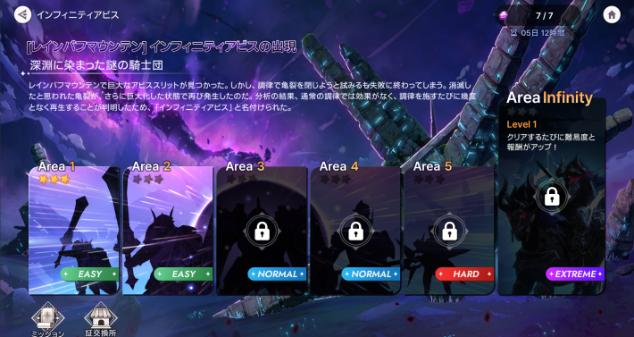 インフィニティアビスの挑戦には無限深淵の防護石という挑戦権アイテムを消費します。防護石は週のはじめに7つ回復するほか、謎の騎士団の証交換所でも入手できます。
