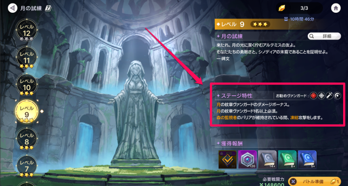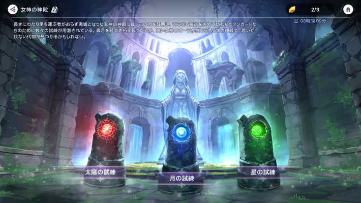 女神の神殿は、キャラのアビリティ強化に必要な「古書」を入手できるコンテンツです。またステージごとにレベルが存在し、レベルが上がるごとに素材の入手量や素材のレア度が上昇します。