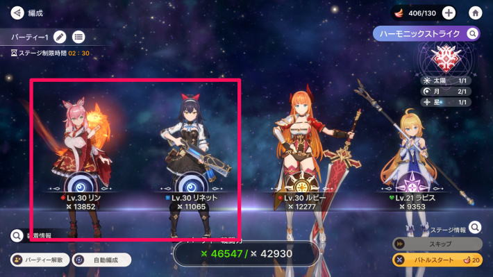 攻略のポイントとして、ハーモニックストライクは必ず発動させましょう。敵全体に大ダメージを与えられます。オートプレイだとハーモニックストライクの発動は難しいため、手動でのプレイがおすすめです。