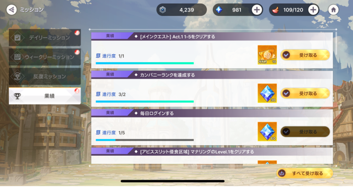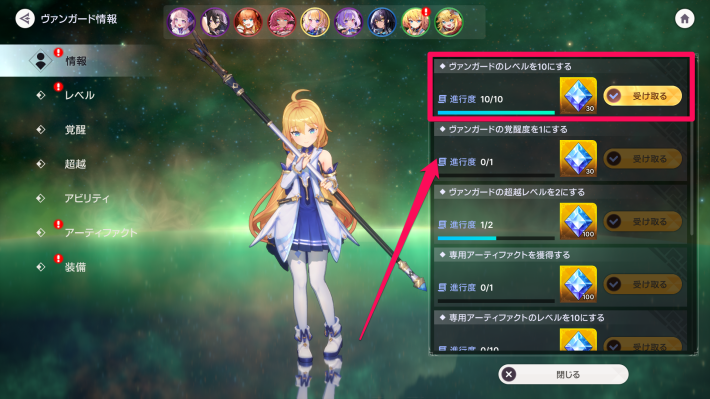 キャラクターにはそれぞれアチーブがあり、これらを獲得するとエストをすぐに集められます。キャラ獲得報酬で各100個、レベル10報酬で各30個入手でき、4キャラ分合計520個入手できます。キャラアチーブは「ヴァンガード情報」から受け取ることができます。