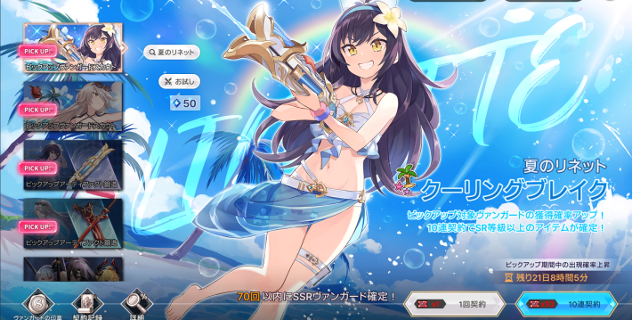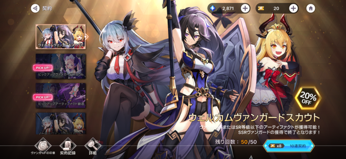 | 引ける回数 | ウェルカムヴァンガードスカウト20回 +ピックアップスカウト1回(or5回) +いずれかのガチャ10回 ※Act1 1-5までクリアでウェルカムヴァンガードスカウト+10回 |