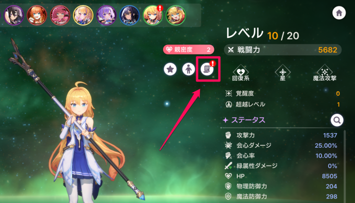 事前登録報酬でキャラクターの育成に必要な経験値ポーションが配布されているため、手持ちの4キャラをレベル10まで上げておきましょう。経験値ポーションを温存しておきたい場合、レベルは上げなくても十分なエストを集められます。