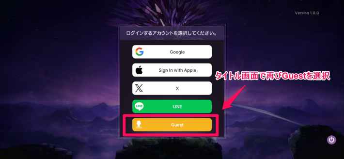 アビスディアでリセマラする場合は、まずは「ゲスト」でゲームを開始します。PC版の場合、ゲストログインがないためアカウントを連携する必要があります。
