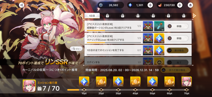 | ピックアップSSRキャラ1体以上 | 終了 |