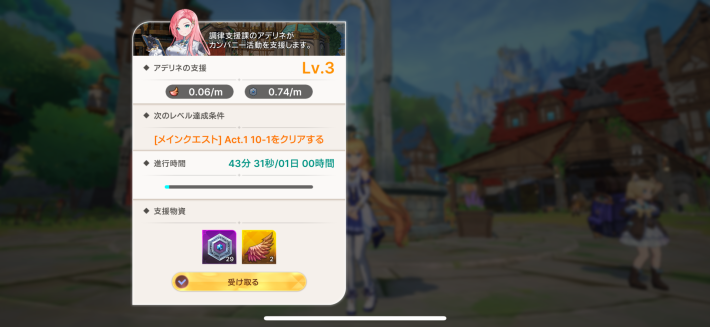 アデリネの支援は長時間のメンテナンスが行われる場合、スタミナ同様報酬が溢れてしまう可能性が高いため、前もって受け取っておきましょう。