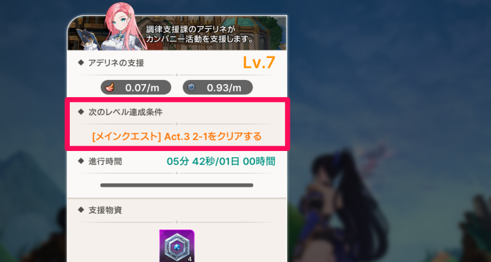 アビスディアのアデリネの支援はメインクエストを一定の場所まで進めることによって、レベルが上昇していきます。レベルが上がると1分ごとの報酬獲得量が増加します。