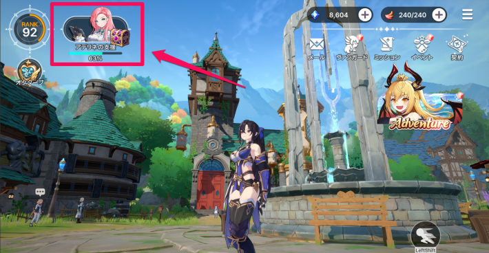 アデリネの支援はタウン時の左上、ランクの横にあるアイコンから受け取ることができます。