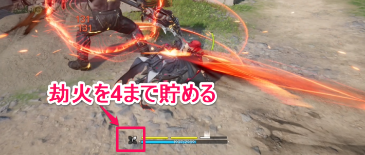 劫火が4段階に達したら戦技を発動しましょう。追加攻撃、必殺チャージの獲得、敵の灼熱耐性ダウン、燃焼状態の付与によって連携技の発動条件を満たす、とメリットだらけです。