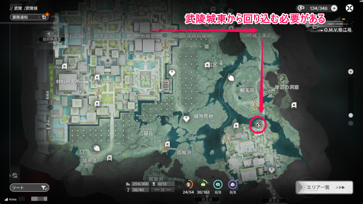 武陵の保管ボックスは、最初に到着する備蓄エリアからはいけません。天師杭陣→修繕工場区→観天院→備蓄エリアに向かう橋を架けて向かいましょう。他にも、備蓄エリアの扉を解放できるポイントがあるため、開放しておくと、備蓄エリア側内の移動が楽になります。