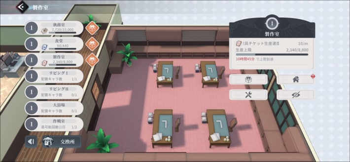 アイテム生産を行う、執務室や製作室も優先して強化することがおすすめです。強化することで、生産速度や生産上限が上昇するためアイテムを多く獲得可能になります。