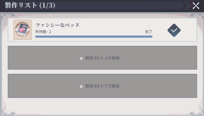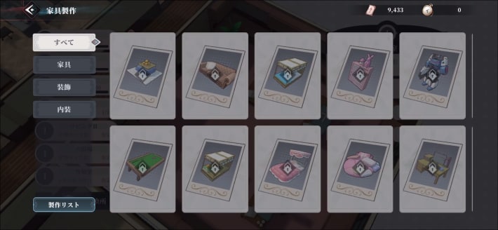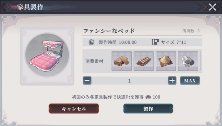 製作室では、家具を作成できます。家具はリビングに配置できるほか、各家具を初回生産した際に快適Ptを獲得可能です。