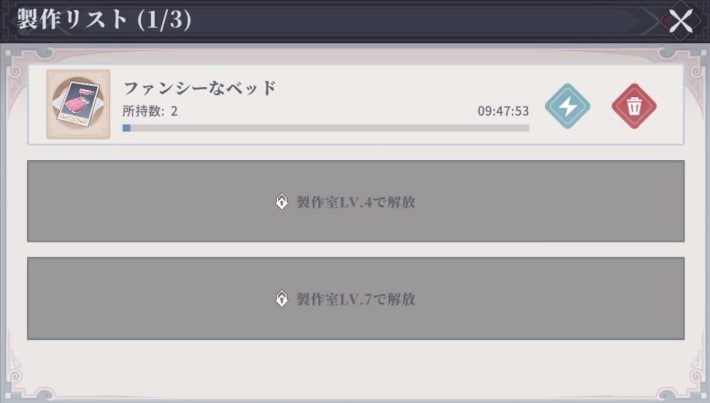 材料を揃えて製作ボタンを押すと、家具の作成が始まります。家具ごとに決められた製作時間を待つ必要があり、交換所で獲得できる不思議な懐中時計を使うことで時間を短縮可能です。