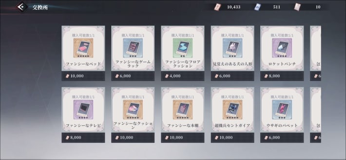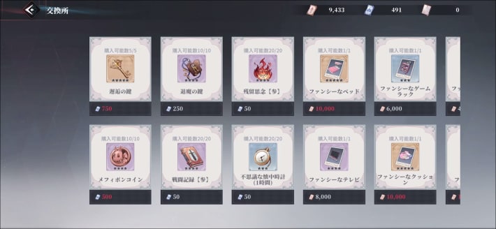 マイルームにある交換所では、邂逅の鍵、育成素材、家具のレシピなどを購入できます。購入にはマイルームチケットや家具チケットが必要になるので、マイルームのアイテム生産で集めましょう。