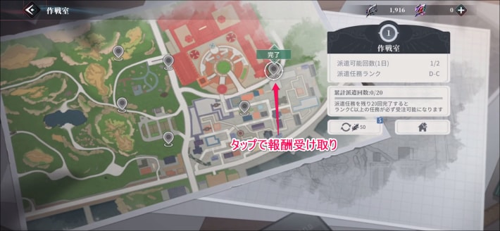 派遣は、一定時間放置すると自動的に完了します。完了したら、マップのピンをタップして報酬を受け取りましょう。