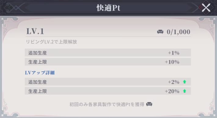 快適Ptを一定まで溜め、リビングのレベルを上げると快適レベルを上げることができます。 快適レベルを上げることで、自動生産アイテムの上限が上昇し、アイテムを獲得したときに追加でアイテムを入手可能です。