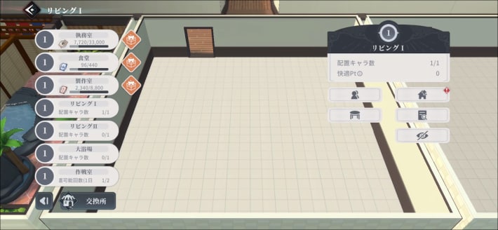 リビング | ★★★★・ ・家具やちびキャラの配置が可能 ・リビングレベルを上げると快適レベルを上げられる ・快適レベルが上がると生産量や上限が増加 |