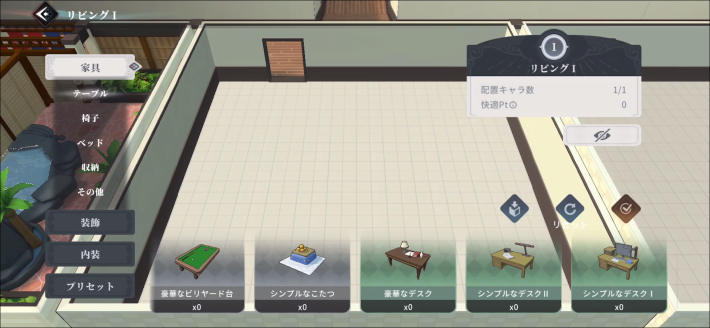マイルームにあるリビングでは、部屋を自由にカスタマイズできます。所持している家具やちびキャラを自由に配置できるほか、予め用意されているプリセットを使用することも可能です。