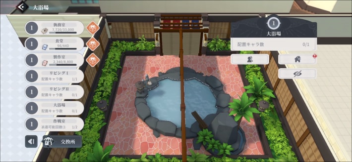 大浴場を強化すると、ちびキャラの配置数が増加します。アイテムの獲得や家具の生産に関わらないため、ちびキャラが過ごしている様子を楽しみたい場合に強化を行いましょう。