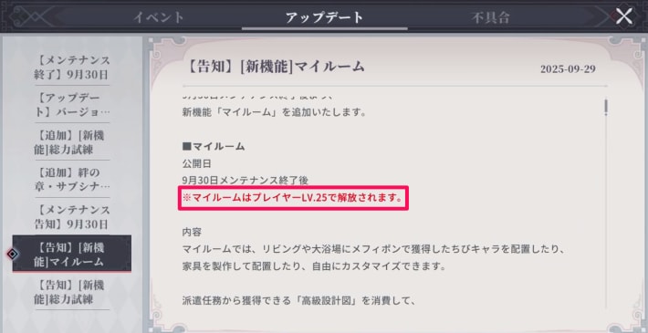 マイルームは、プレイヤーレベルを25まで上げると解放されます。プレイヤーレベルはメインシナリオの進行やチャレンジで上げることができるため、解放されていない場合はプレイヤーレベルを上げましょう。