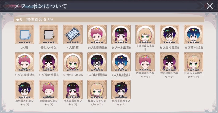 ちびキャラは、メフィポンを回すことで入手できます。メフィポンはミッションから引くことができ、メフィポンコインを消費して景品を獲得可能です。