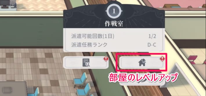 部屋のレベルアップは、上矢印がついたアイコンをタップすることで可能です。部屋によってレベルアップで強化される内容が異なるため、強化前に確認しておきましょう。