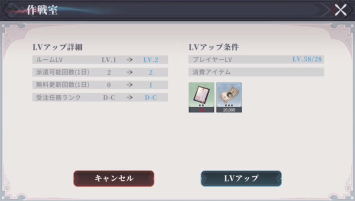 派遣で入手した高級設計図を使用することで、各部屋のレベルを上げることができます。レベルを上げることで、部屋に応じてアイテム生産の増加、配置キャラ数の増加、派遣回数の増加などが可能です。